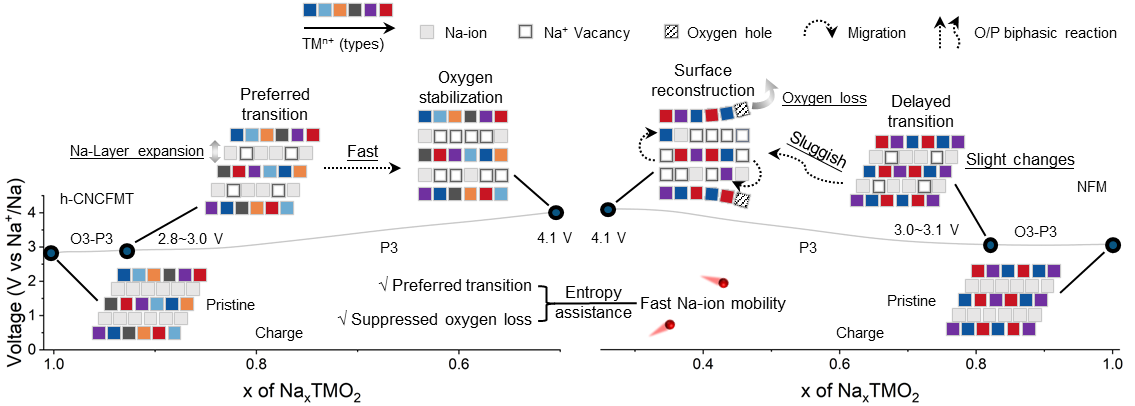 目前,O3型层状氧化物在实现快充的同时保持高能量密度和长循环寿命仍面临挑战,主要障碍在于钠离子(脱)嵌过程中O型与P型结构之间不可避免的相变。尽管这种相变有助于提高可逆容量,但却降低了钠离子迁移率和材料的结构稳定性。此外,O-P相变中不同的相变行为对钠离子扩散动力学也有着显著影响,而这种差异往往被忽视。O3型氧化物中过度的阴离子氧化还原还会导致高荷电状态下晶格中不可逆的氧损失,从而加剧结构崩塌和电解质分解,进而影响电池性能。