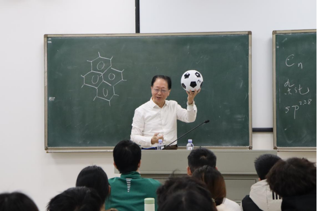 随后,郑兰荪院士在教学楼A座124教室为我院强基计划学生及部分师生代表讲授了“物质结构与原子团簇”示范课程。他从“所有物质都是由分子组成的吗”这一看似简单的问题出发,启发学生思考。然后从物质结构的基础知识拓展到原子团簇的概念,从原子团簇的讲解中引出非分子物质、化学键、悬挂键等概念,最后回归到物质结构,同时将科研最新进展与基础知识进行巧妙的衔接。郑院士全程靠粉笔板书,课程逻辑性极强,连擦黑板的时间都会留问题给学生思考。