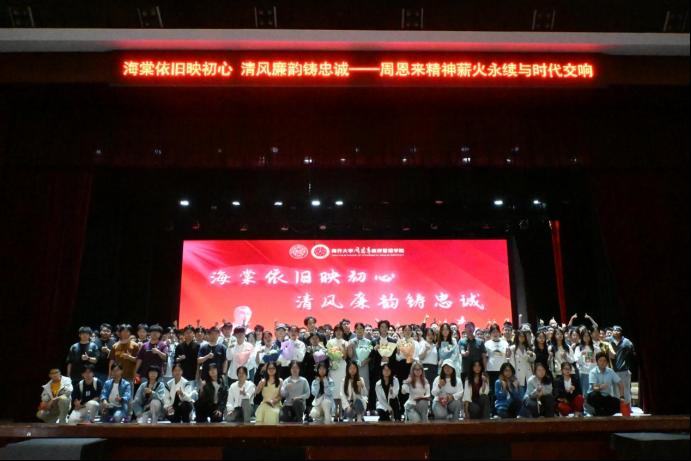 四个部分,十二个故事,生动展现了周恩来总理的崇高精神和人格魅力。展演分为《立志报国怀壮志,挥毫赋诗写华章》《勤政爱民兴盛世,清风正气铸清廉》《迟暮仍怀忧国心,鞠躬尽瘁述忠诚》《海棠依旧思总理,花祭深情念故人》四幕,宣讲团成员动情讲述了周恩来的生平故事,在伯延村调研时与群众同吃同住同劳动、亲自了解百姓疾苦;一餐一饭都严格遵循规定,每月工资的每一项支出都清晰明确;在生命的最后阶段,周总理依然坚守岗位,为国家和人民操劳,直至最后一刻。这些生活中的点滴细节,如同一盏盏明灯,照亮了青年学子前行的道路,教导大家要坚守廉洁底线,发扬艰苦奋斗的优良传统。在《我和我的祖国》的歌声飘扬中,展演落下帷幕。