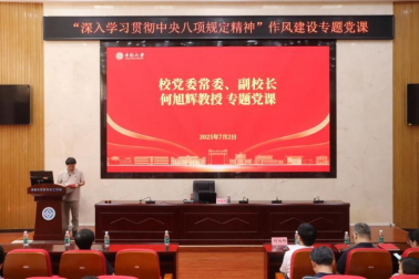 2025年7月2日上午,校党委常委、副校长何旭辉教授在潇湘校区化学楼133报告厅讲授“深入学习贯彻中央八项规定精神”作风建设专题党课,校保卫部、后勤保障部、基建处、附属学校管理中心班子成员,及外国语学院、机电工程学院、化学化工学院师生代表,共计200余人参加学习,本次党课由化学化工学院党委书记刘有才主持。