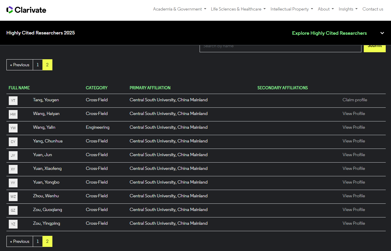 科睿唯安2025全球高被引科学家名单揭晓 中南大学化学电源湖南省重点实验室5人入榜