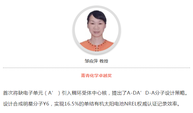为鼓励青年化学工作者进行原创性研究,进一步促进和推动我国青年化学工作者的成长,中国化学会青年化学工作者委员会(青委会)于2019年设立“菁青化学奖”。2019年10月24日,在青委会于重庆举办的第二届菁青论坛期间,举行首届“菁青化学奖”颁发仪式,12位在化学及相关科研领域中表现卓越的青年化学工作者和学生荣获奖项。我院青年教师邹应萍获中国化学会青委会首届菁青化学卓越奖。