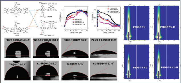 基于此,中南大邹应萍教授团队与加州大学洛杉矶分校的杨阳教授团队及中国科学院化学研究所易院平研究员团队合作,设计并合成了一个吸收带边在953nm的新型A-DA’D-A型非富勒烯受体Y1-4F(Y3)。为了系统研究氟原子对活性层形貌和给/受体能级的调控作用,给研究者提供普适性的给受体选择规则,研究团队选用了两个商业化的给体PBDB-T和PBDB-T-F以及三个受体:Y1,Y5和Y6作为研究对象。通过对分子间相互作用力以及能级匹配的调控,发现使用双氟化或两种非氟化给体/受体共混物可以实现高效的电池器件。基于PBDB-T-F /Y1-4F(Y3)和PBDB-T-F/Y6的器件具有宽的吸收,理想的形貌和有效的电荷转移,分别获得14.8%和15.9%的效率。此项研究意义在于通过优化分子结构得到了重要的给/受体匹配规则,最终实现了光伏器件的理性优化。