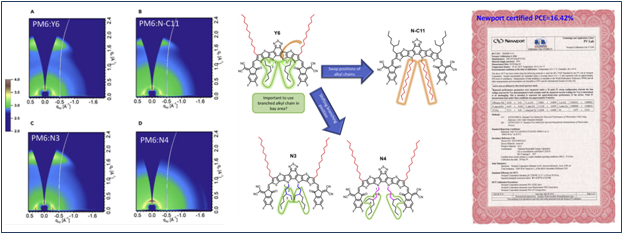 鉴于此,邹应萍教授团队在非富勒烯材料设计方面首创性地提出了受体-给体受体给体-受体(A-DA’D-A)型分子策略,可显著拓宽材料的吸收光谱、提高电子迁移率并减少开路电压损失。通过匹配合适的聚合物给体材料,多次刷新了有机太阳能电池效率的世界权威认证纪录。其中,极为重要的是今年在《Joule》上(Joule, 2019, 3,1140-1151)发表的明星分子Y6,实现单结有机太阳能电池效率首次突破15%。此工作在短期内正面引用高达318次,位列2019年度太阳能电池领域已发表论文引用桂冠。基于此,邹应萍教授团队与香港科技大学颜河教授团队合作,进一步优化Y6分子,调控结晶性及形貌,以期获得更优异的光伏性能。在此工作中,分别使用3号/ 4号位分叉支链来替代Y6中2号位分叉支链,进而获得非富勒烯受体N3和N4。通过掠入广角X射线衍射(GIWAXS)及共振软X射线衍射(RSoXS)测试,发现基于N3的非富勒烯受体分子具有比Y6更加优良的共混膜形貌及相尺寸大小。以N3分子作为受体制备的器件,经优化获得了16.42%的权威验证效率。