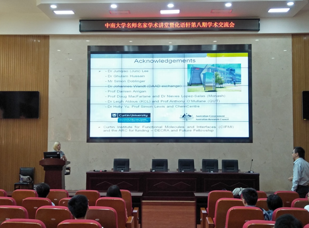 2019年5月22日上午10:00-11:30,在中南大学新校区化学楼133报告厅举办了主题为“Electrochemical Detection of Gases and Explosives in IonicLiquids”的学术讲座,报告人是来自澳大利亚科廷大学的Debbie S. Silvester副教授。该讲座由纪效波教授主持,来自全院相关学科的师生们聆听了Debbie S. Silvester副教授的精彩讲座。