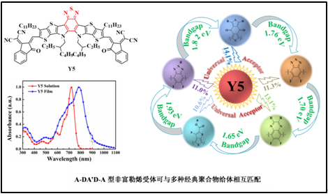 邹应萍教授课题组基于前期提出的A-DA’D-A非富勒烯分子设计策略,通过化学合成手段将经典有机缺电子单元苯并噻二唑作为A’引上述分子体系中,形成一种稠环DA’D中心核,与氰基茚满二酮缩合,获得A-DA’D-A型有机小分子受体光伏材料Y5。研究表明,Y5具有较合适的电化学能级和较窄的光学带隙(1.38 eV)以及优异的电子迁移率(2.11×10-4cm2·V-1·s-1)。