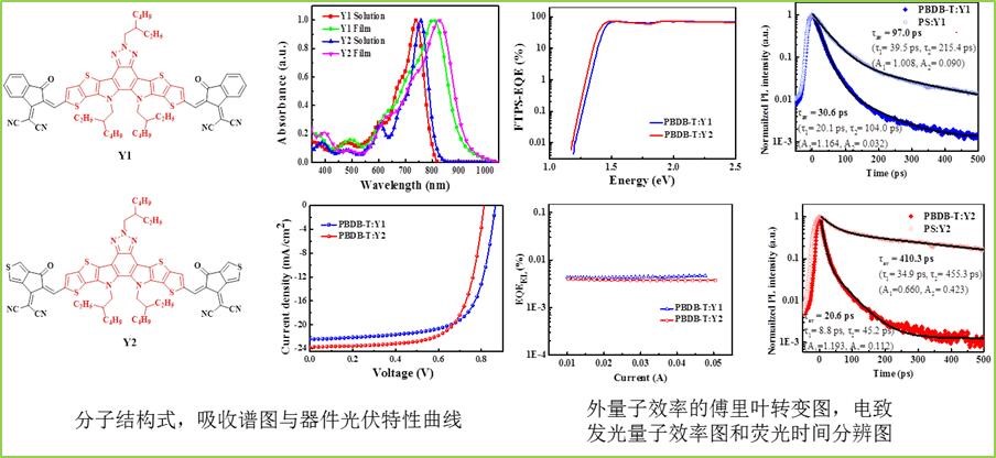 邹应萍教授课题组除了考虑有机太阳能电池材料能级匹配、吸收光谱互补和迁移率平衡外,还从热力学、空间构型等角度考虑材料的兼容性,在2017年首次将电子受体单元苯并三氮唑引入非富勒烯受体稠环中心核,形成一种DAD稠环结构,进而合成了A-DAD-A型有机小分子受体光伏材料。这种A-DAD-A型小分子受体可有效拓宽吸收光谱,降低器件电压损失,此分子设计策略为材料合成提供了新思路(ACS Appl. Mater. Interfaces 2017, 9, 31985?31992)。随后,保持中心核不变,用并二噻吩取代稠环两端的噻吩,将此分子体系从五元环拓展为七元环,并改变不同的端基,设计合成了Y1和Y2非富勒烯受体。邹应萍教授课题组与美国加州大学洛杉矶分校杨阳教授团队及瑞典林雪平大学高峰教授团队合作,经器件优化获得了12.6%的权威认证效率,该效率收录在2018年7月美国可再生能源实验室(NREL)“最佳电池效率”表中。