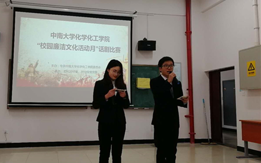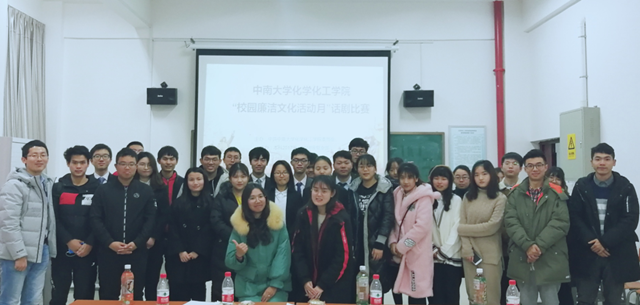 1月17日下午,由学院党委主办,本科2017级党支部、本科2018级党支部承办的“中南大学化学化工学院‘校园廉洁文化活动月’话剧比赛”在化学楼129教室圆满落下帷幕。本科2017级各团支部共11支队伍参加比赛。院党委组织干事李璞老师、本科2017级党支部书记刘世宏老师、本科2018级党支部书记白丹妮老师、本科2018级辅导员张沛毅和华绪雨老师担任此次比赛评委。