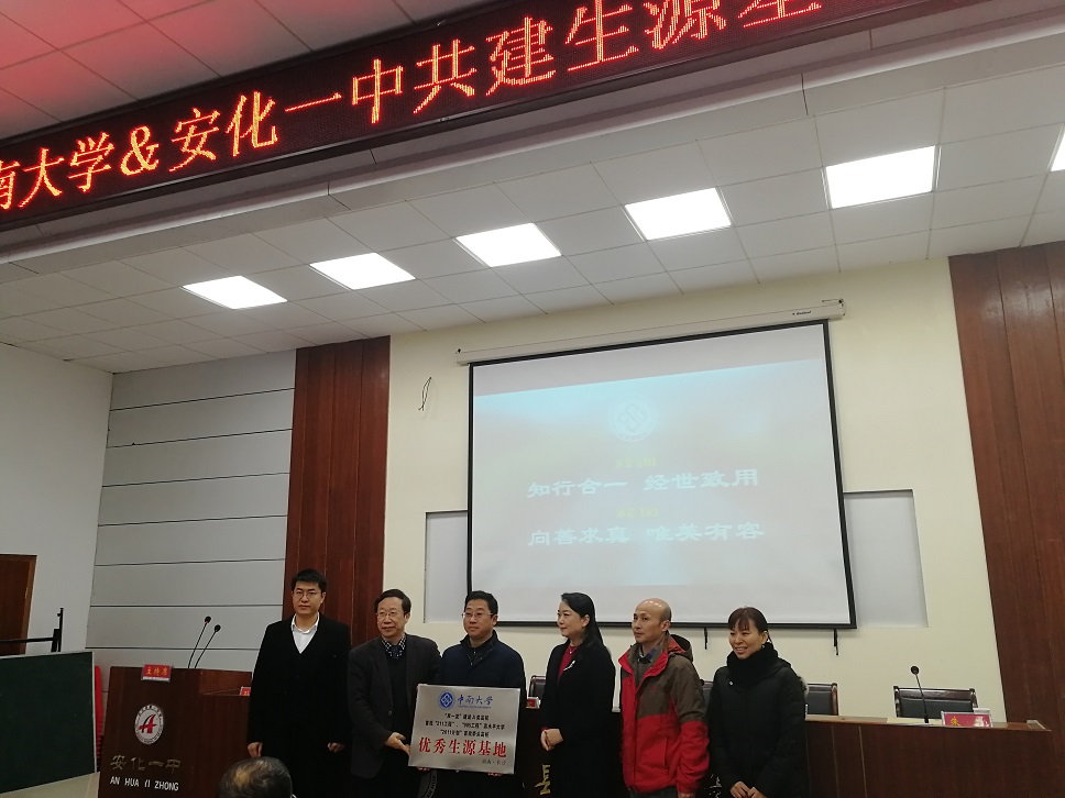 12月14日下午,中南大学与安化一中共建优秀生源基地授牌仪式在安化一中培英楼报告厅举行。中南大学本科生招生办公室主任赵晓霞,中南大学益阳招生组组长、中南大学化学化工学院党委书记马跃如,化学化工学院党委副书记刘有才等一行六人,安化一中校长李拥军及200余名师生参加授牌仪式。