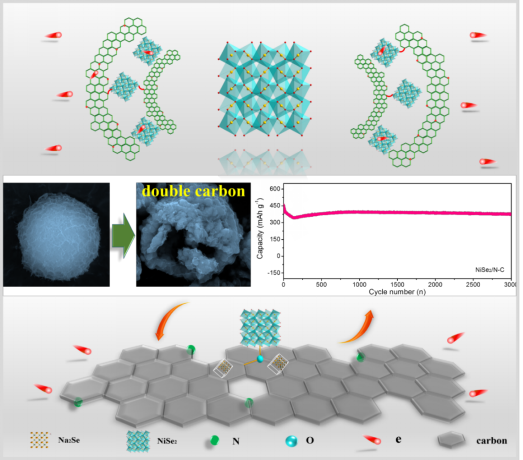纪效波教授团队在设计调控金属硒基材料与碳基质的界面特性方面取得新进展。通过自组装的手段设计合成线了团状的碱式碳酸镍(Ni-Pr),利用其较大的比表面积将吡咯单体吸附其中进行聚合反应。利用Se单质以及高温下的柯肯达尔效应,成功的生成了碳包覆的多级中空结构。体系成功地引入了金属氧-碳键以及衍生的双碳层结构,有效地提升了材料的反应可逆性,缓解材料的体积膨胀,深化电化学反应进行深度。在钠离子能量存储领域展现出优异的性能,该工作对于金属基材料的设计以及衍生具有重要的指导意义。研究成果近日发表在《先进能源材料》(Advanced Energy Materials, 2018,DOI: 10.1002/adma.201803035)(IF = 21.875)。