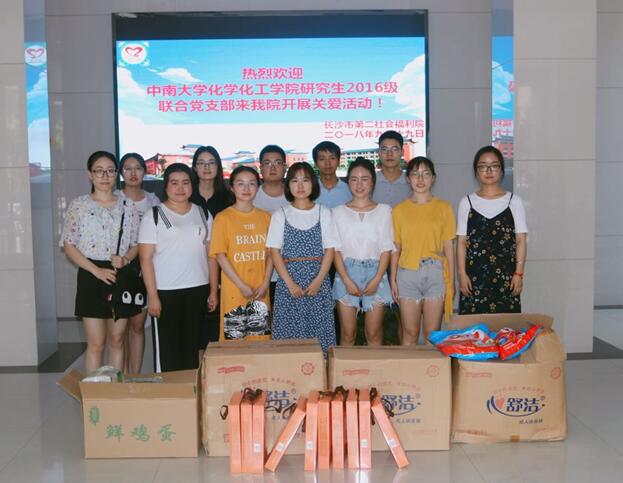 9月19日下午,研究生2016级联合党支部党员及部分积极分子前往长沙市第二社会福利院开展主题为“情系福利院,中秋送温暖”的党日活动,为福利院送去了用支部党建经费和支部成员捐款所购得的价值近2000元的慰问物资(洗衣粉、成人纸尿裤、月饼等),并和福利院的老人们和孩子们进行了亲切交流和互动。