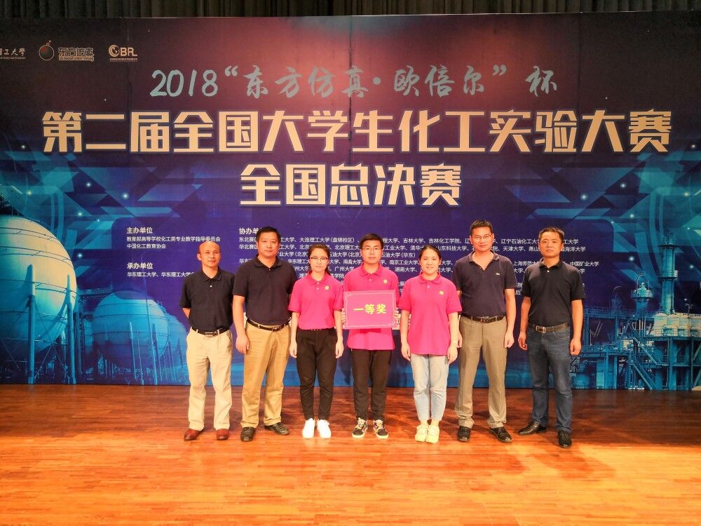 2018年8月12-14日,“东方仿真·欧倍尔”杯第二届全国大学生化工实验大赛全国总决赛在华东理工大学举行,在教育部高等学校化工类专业教学指导委员会主任委员、天津大学前副校长冯亚青教授宣布开幕后,从全国六个赛区脱颖而出的64所高校(其中包括清华大学、浙江大学、天津大学、四川大学、吉林大学、中南大学、大连理工大学、北京化工大学、华东理工大学等实力强劲的高校)参赛队伍展开了激烈的角逐,最终中南大学化学化工学院 “共轭酸碱队”荣获全国一等奖。