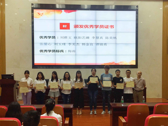 结业典礼在铿锵激昂的国歌声中拉开序幕。首先范帆老师介绍了本期培训班的基本情况:本期培训班共有学员84名,其中本科生72名,研究生12名。通过参加学习培训,社会实践和结业考试,共有83名学员顺利结业。其中刘雅文 、欧阳艺姗、李慧真、 陈美帆、张馨心、刘玉瑾 、李美杰、韩金良、谭锦勇共9名同学获评优秀学员,梅雨获评优秀学员标兵。刘有才同志依次为他们颁发优秀学员证书。