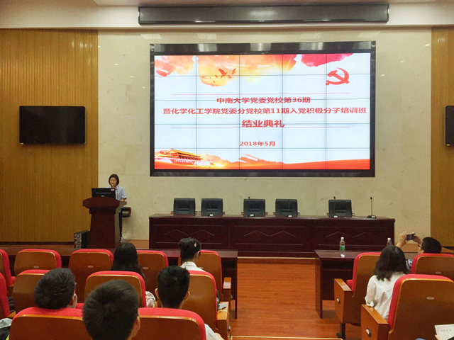 5月30日下午2点,中南大学党委党校第36期暨化学化工学院党委分党校第11期入党积极分子培训班结业典礼在化学楼133报告厅隆重举行。化学化工学院党委副书记、分党校副校长刘有才同志、院党委组织员李璞同志、本科2016级党支部书记范帆同志以及培训班全体学员参加。结业典礼由班导师范帆主持。
