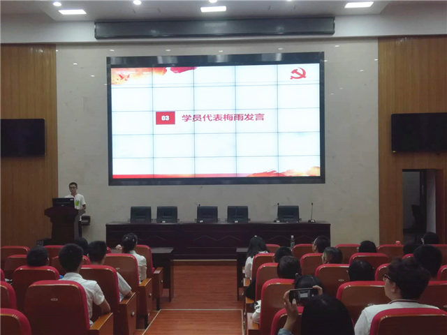 接下来由优秀学员代表梅雨发言,他分享了参加本期培训班的收获和体会并代表全体积极分子向党组织承诺一定会牢记时代赋予的重任,从完善自身做起,争取早日组织上入党,思想上入党。