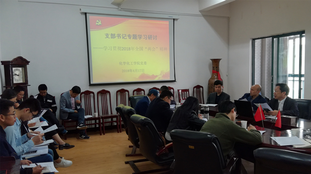 4月17日,化学化工学院党委在化学楼229会议室召开传达学习2018年全国“两会”精神会议。院党委书记马跃如传达了全国人大十三届一次会议精神、全国政协十三届一次会议精神。院党委副书记刘有才、全体教职工党支部书记、学生党支部书记和组织员参会。刘有才主持会议。