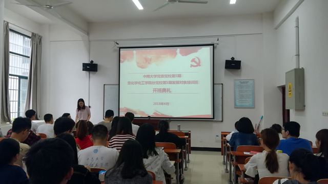 4月11日,中南大学党委党校第5期暨化学化工学院分党校第5期发展对象培训班开班仪式在新校区化学楼128教室举行。化学化工学院党委书记、分党校校长马跃如,院党委委员杨娟,组织员李璞和发展对象培训班班导师杨宵以及39名发展对象参加。仪式由班导师杨宵主持。