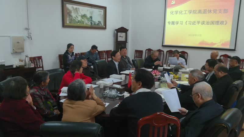 4月1日上午,化学化工学院离退休党支部召开专题组织生活会,学习《习近平谈治国理政》(第二卷)。支部书记蒋利武主持会议。联系院领导院党委书记马跃如出席并讲话。