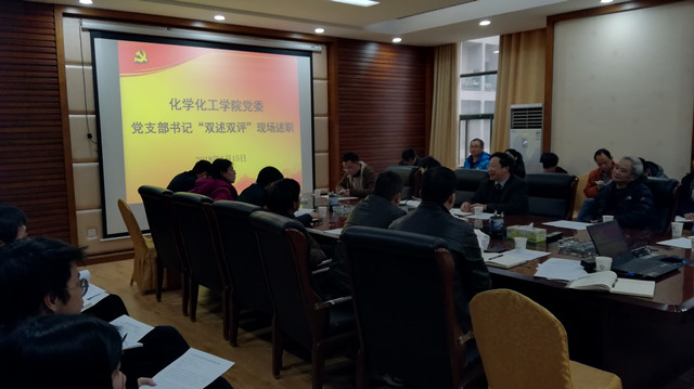 2018年1月15日下午3点,化学化工学院2017年度党支部书记“双述双评”现场述职评议大会在化学楼230举行。学院全体党委委员和支部书记参加。会议由专职组织员李璞主持。
