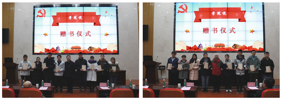 图4 “学院说”——罗永忠书记、刘有才副书记代表学院党委为学生代表赠党史书籍