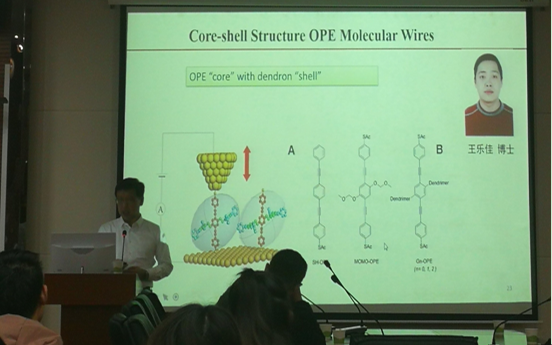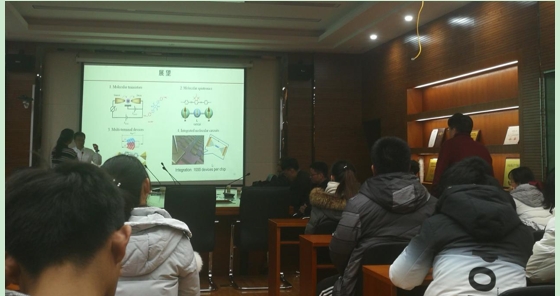 报告会上,张浩力教授为我们介绍了什么是“摩尔定律”,摩尔定律指的是集成电路上晶体管数目约每隔18个月便会增加一倍。这意味着每一个电子元件的尺寸都会越来越小。那么,电子元件最小能做的多小呢?有种看法就是最小的电子元件可以是单个分子,于是“分子电子学”的概念应运而生。分子电子学研究的是分子水平上的电子学,其目标不但是尝试用单个分子代替传硅基半导体元件组装逻辑电路,更是要探索当电子在通过单个分子传输的过程中会出现哪些新奇的现象。张教授指出,当对单个分子施加电场时,将会产生一系列特殊现象,比如纳米器件可以产生超高的局域电场强度,超高的局域电场强度又将会给分子带来一系列的影响,如分子形变、诱导分子异构、改变分子的氧化还原状态、引发特定的化学反应等等。