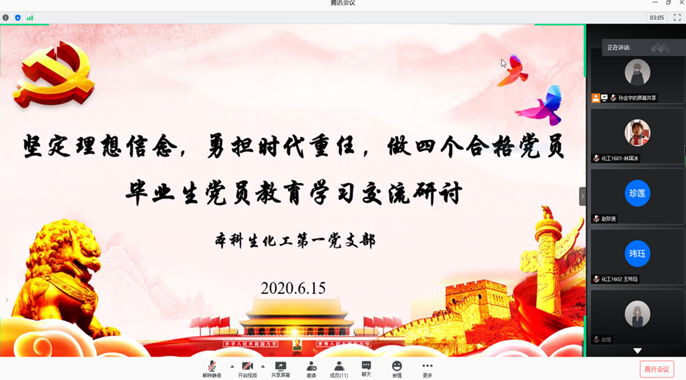 本科生化工第一党支部的刘雅文同志在研讨中提出,身为一名党员,我们首先应该“旗帜鲜明讲政治”,做政治上的明白人;其次要自查自省,时刻牢记党规党纪,用纪律合格来要求约束自己的行为;同时要以道德合格为价值导向,要坚持以人民为中心的发展思想,始终把人民放在心中最高位置,坚持一切为了群众、一切依靠群众,从群众中来、到群众中去;最后要充分发挥党员的先锋模范带头作用。在这次的抗击新冠病毒阻击战中,党员干部冲锋在前、顽强拼搏,充分发挥了先锋模范作用,为我们毕业生党员树立了榜样。