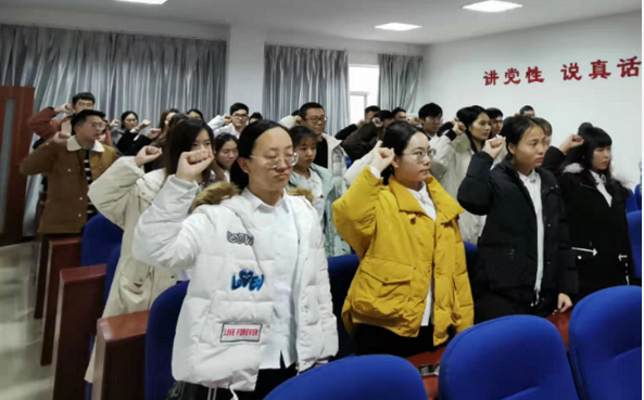 大会在庄严的国歌声中拉开序幕。张沛毅宣读了学院2019年下半年新发展的党员名单。随后进行了入党宣誓仪式。由李璞领誓,到场的47名预备党员郑重宣誓。