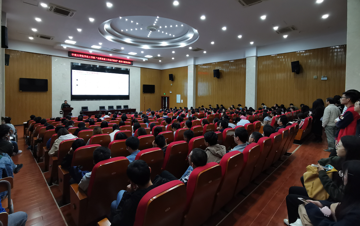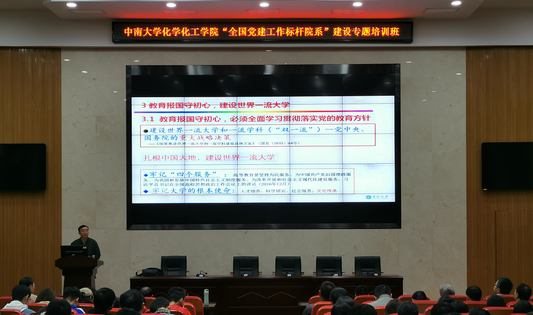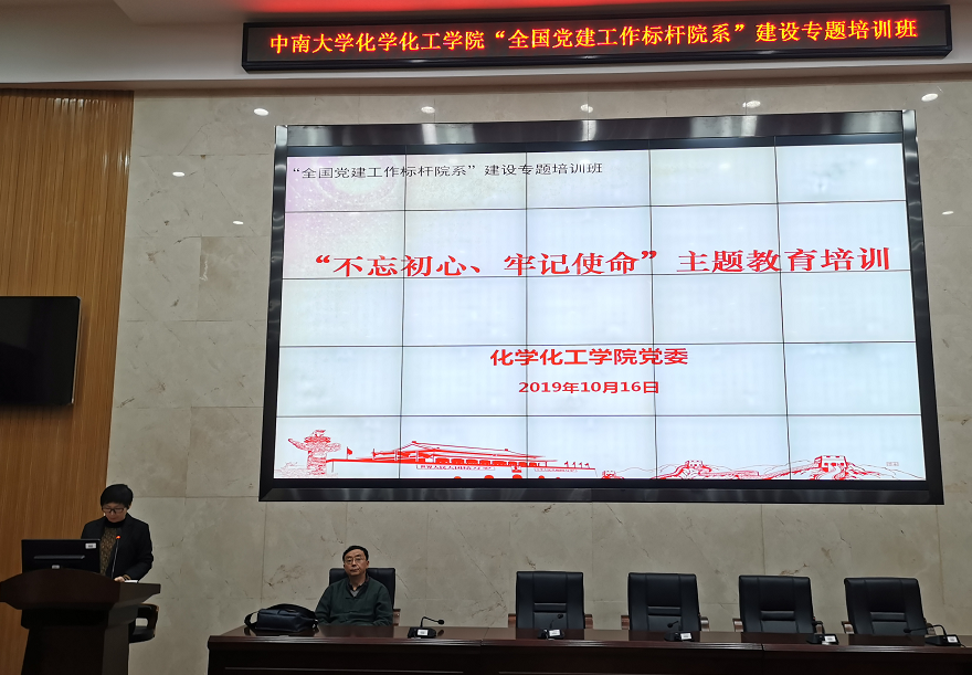 为进一步增强学院党员师生不忘初心、牢记使命主题教育学习成效,高质量推进党建标杆建设工作,1016学院党委在化学楼133报告厅举办第五期全国党建工作标杆院系建设培训班。校党委常委、常务副校长胡岳华为我院师生作不忘初心、牢记使命主题教育培训。院班子成员刘又年、纪效波、阳华、刘广义,全体教职工党员、学生党员代表以及部分入党积极分子参加学习。培训会由院党委委员、副院长卢红梅主持。