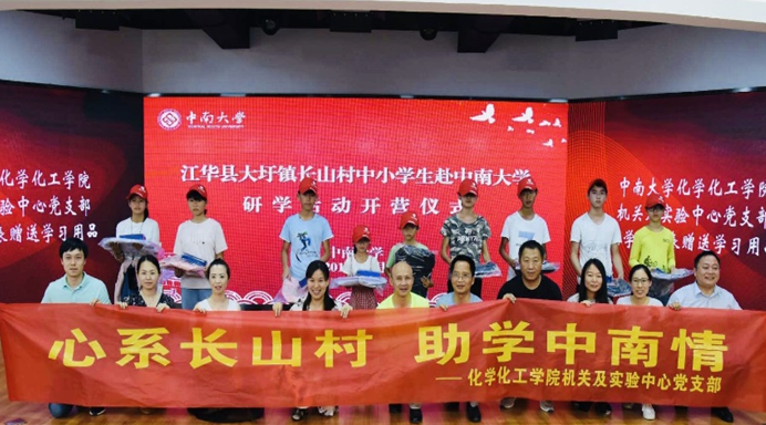 化学化工学院机关及实验中心党支部紧跟校党委、校扶贫办步伐,开展“心系长山村,助学中南情”的爱心捐赠活动。学院党委副书记刘有才同志、机关及实验中心支部书记张茂林同志带领支部党员,向同学们赠送书包、笔袋,鼓励他们用功学习。希望他们克服困难,坚持学习。通过学习来改变家乡,造福家乡。希望他们4天的研学活动收获满满,也期待他们以后能以优异的成绩考入大学,为新中国的建设添砖加瓦。
