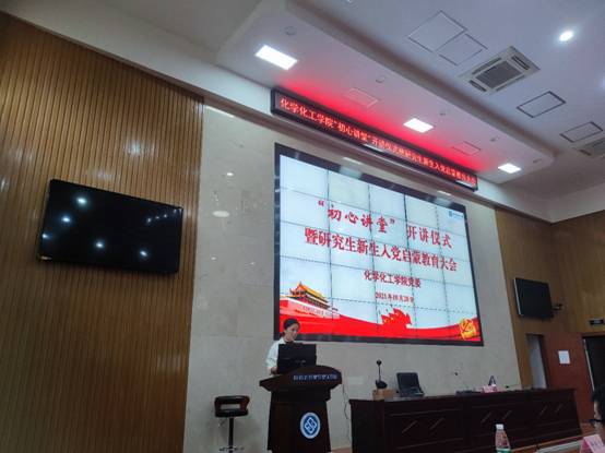 10月28日下午,学院党委在新校区化学楼133报告厅举行“初心讲堂”开讲暨2021级研究生新生入党启蒙教育活动。院党委书记罗永忠作“初心讲堂”首讲。院党委副书记刘有才、组织员李璞、学工办副主任白丹妮、本科生辅导员于悦凡、博士生党员邹康宇出席。全体2021级研究生新生通过线上、线下方式参加此次活动。活动由学工办主任、2021级研究生辅导员滕晓雯主持。