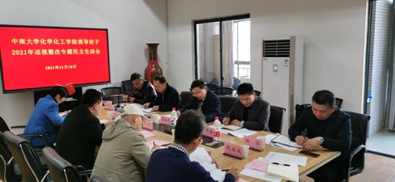 11月10日上午,化学化工学院领导班子2021年巡视整改专题民主生活会在新校区化学楼229会议室召开。校党委常委、常务副校长胡岳华,人事处副处长刘华森出席会议。院党委书记罗永忠主持会议,院领导刘又年、刘有才、卢红梅、纪效波、刘广义、阳华、宋相志参加会议。