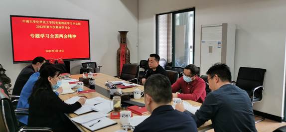3月14日上午,学院党委理论学习中心组在新校区化学楼229会议室召开2022年第六次集体学习会,专题学习全国两会精神。院党委书记罗永忠主持会议并作中心发言。他强调,要深入贯彻习近平总书记近期重要讲话和全国两会精神,进一步统一思想、明确方向,坚定信心、勇毅前行,集中精力办好学院的事,以实际行动迎接党的二十大胜利召开。全体在校中心组成员参加学习。