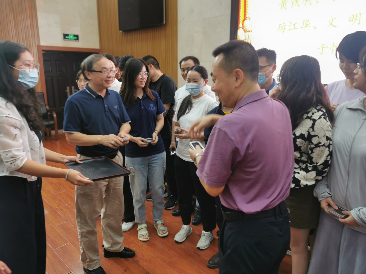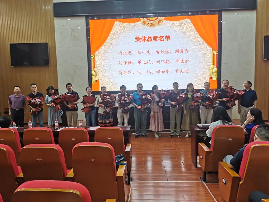 会上,阳华副院长宣读了2022退休教师和2021-2022年新入职教师名单。罗永忠书记、刘又年院长走上台,为退休教师颁发纪念章和鲜花,感谢他们多年为学院的付出,并给新入职教师一一发放纪念品,与他们亲切交谈,鼓励他们承继使命,努力奋斗。