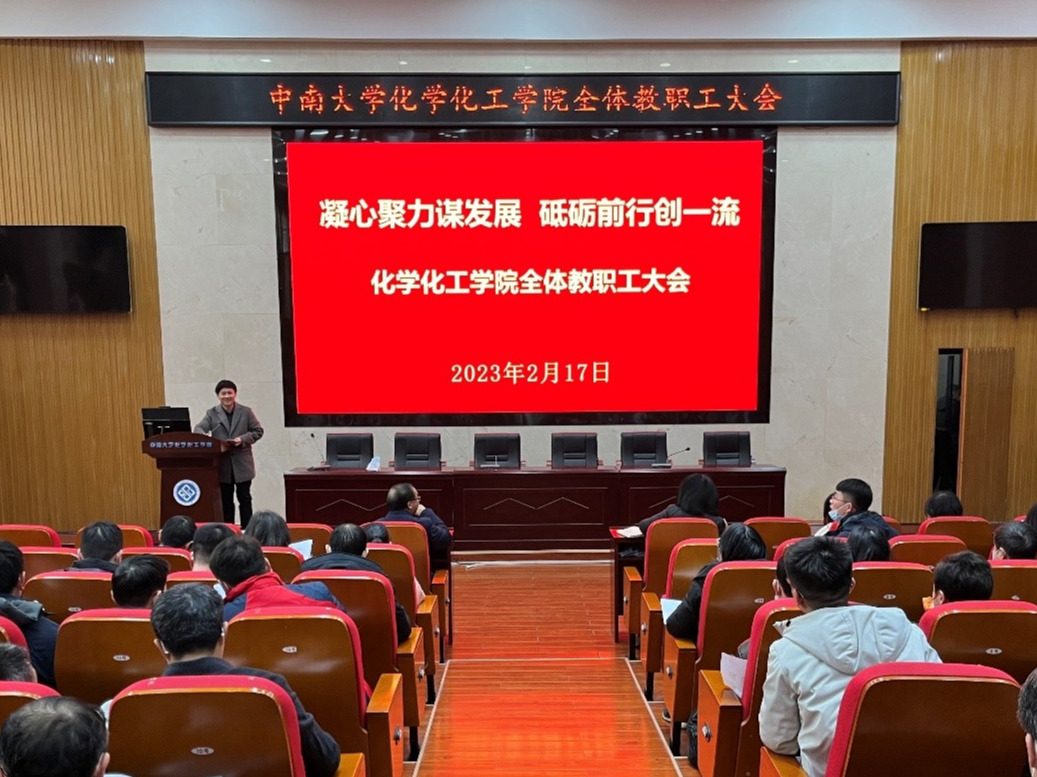 2023年2月17日下午,化学化工学院在新校区化学楼133报告厅成功召开了全体教职工大会。会议由学院党委书记刘有才主持,全院班子成员和教职工近200人参加了会议。