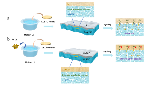 全固态锂金属电池因其高安全性和高能量密度,广受关注,被认为是下一代可充电储能器件的有力候选者。在众多固态电解质中,石榴石型Li7La3Zr2O12(LLZO)凭借其高离子电导率、稳定的电化学性质和宽广的电化学窗口,展现出极大的发展前景。然而,由于LLZO和锂负极之间较差的润湿性以及界面处的电子隧穿效应,导致锂在沉积过程中不均匀,最终形成锂枝晶,严重影响电池性能。因此,构建紧密接触且稳定的Li|LLZO界面以及抑制电子泄露对实现性能优异的固态电池具有重要意义。