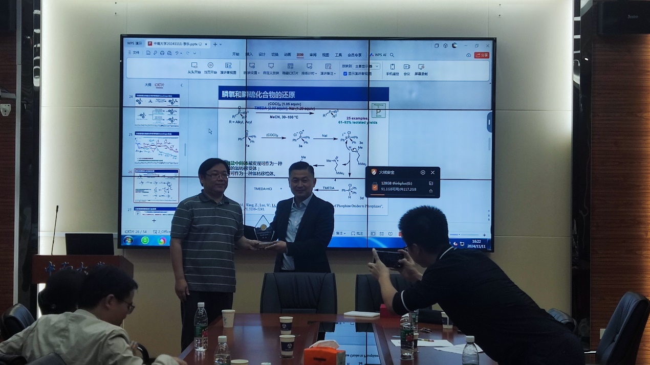 讲座接近尾声,学院老师向李乐教授请教在合成共聚物时机理如果和医学知识相关,能不能避开已发表的专利,李老师回答是可以避开的,找到新的适合课题组自主研发的新路径;也有同学问到关于三苯基磷氧磷硫的还原机理是否有实验支持,李乐教授给出了肯定的答复,同时也详细介绍了实验所用的思想。为感谢李乐教授,阳华教授为李老师送上了学院的名师讲堂纪念奖杯。