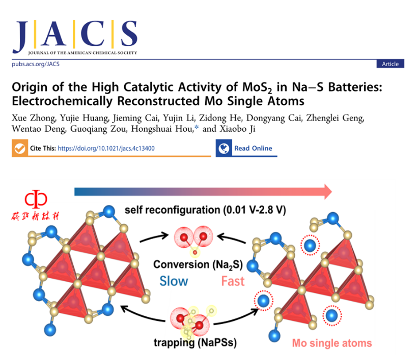 近日,我院纪效波、侯红帅教授团队在化学类顶级期刊《美国化学会志》(Journal of the American Chemical Society)发表了题为“钠硫电池中MoS2高催化活性的来源:电化学重构的Mo单原子(Origin of high catalytic activity of MoS2 in Na-S batteries: electrochemically reconstructed Mo single atoms)”的研究论文。中南大学化学化工学院为唯一单位,侯红帅教授为通讯作者,2022级博士生钟雪为第一作者。