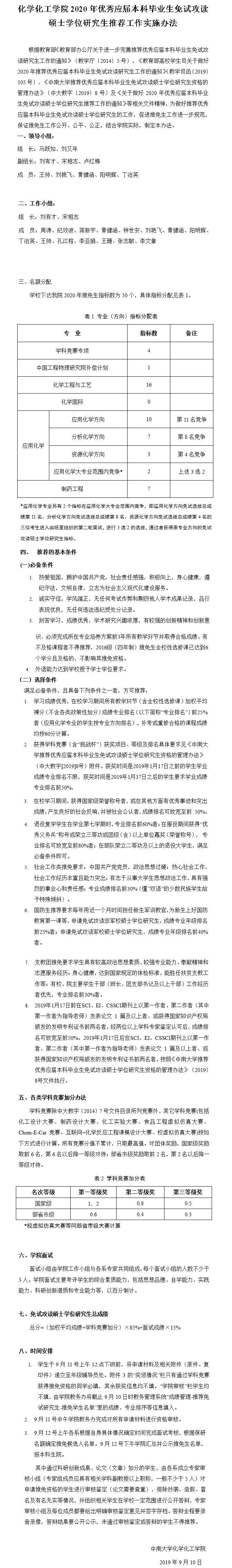 化学化工学院2020年优秀应届本科毕业生免试攻读硕士学位研究生推荐工作实施办法