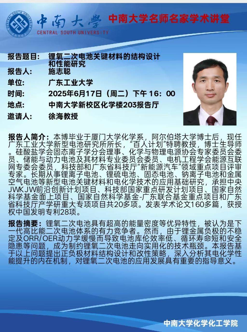 报告题目:锂氧二次电池关键材料的结构设计和性能研究 报 告 人:施志聪 广东工业大学 时 间: 2025年6月17日(周二)下午16:00 地 点: 中南大学新校区化学楼203报告厅