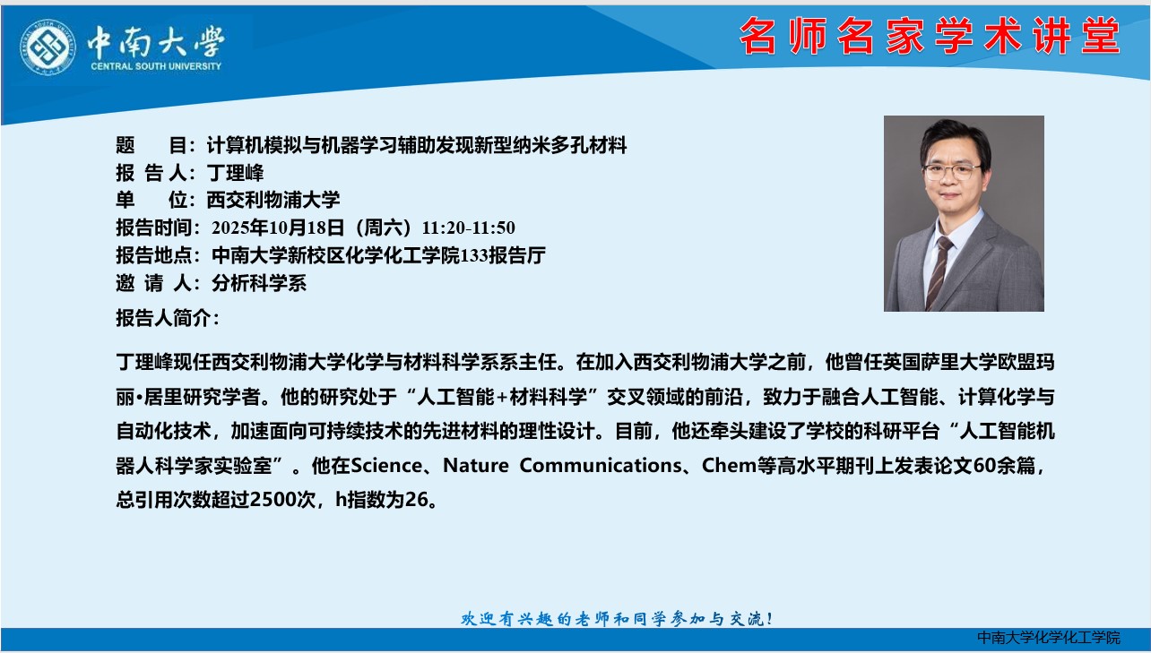 报告题目:计算机模拟与机器学习辅助发现新型纳米多孔材料 报 告 人:丁理峰 西交利物浦大学 时 间: 2025年10月18日(周六)11:20-11:50 地 点: 中南大学新校区化学化工学院133报告厅