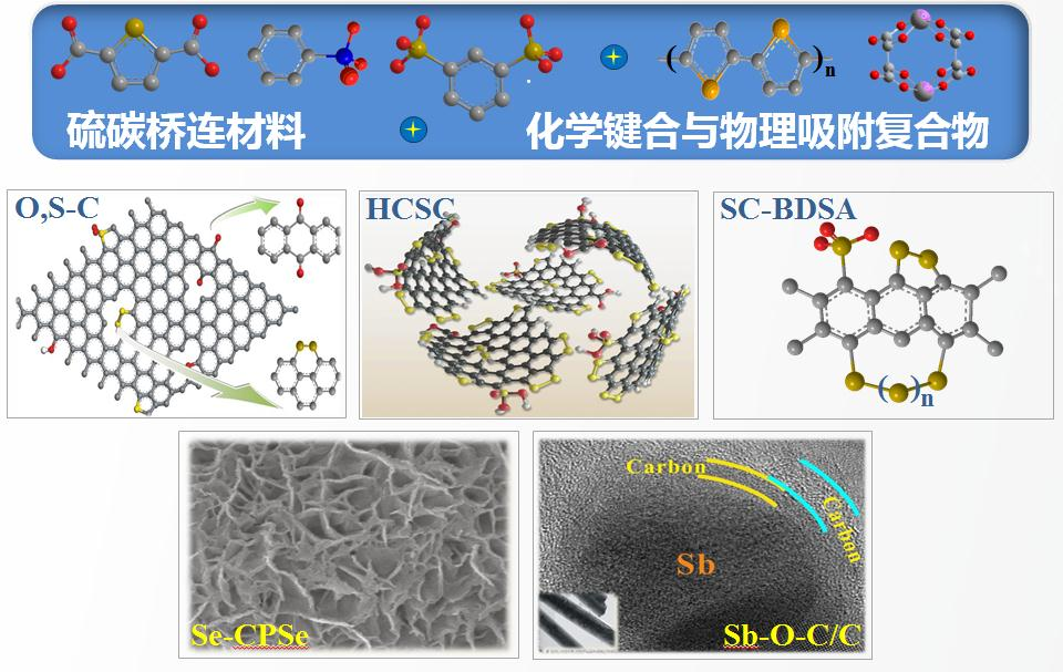 碳材料具有形态多样、微观结构可调控、来源广泛等特点,在储钠领域的研究方面备受关注,但是其储能机制存在明显争议,特别是杂原子改性碳基材料在高电位处表现出明显的储钠容量,这部分容量的来源缺乏合适的解释。硫元素引入到碳基材料中既可以用于钠离子电池体系也可以用于钠硫电池体系,结构的差异性与电化学反应之间的关系并不明确。针对这些问题,该课题组以结构单一的小分子作为前驱体,设计制备了不同碳硫链长度的硫碳材料(OS-C,HCSC和SC-BDSA),并系统地研究这些材料的表界面共价键变化与其储能行为之间的关系。
