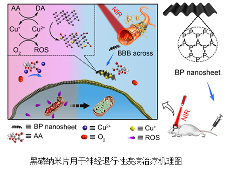 针对此问题,刘又年教授团队创新性地将黑磷纳米片材料用于神经退行性疾病的治疗。黑磷纳米片上丰富的磷原子可以高效结合神经退行性疾病患者大脑中的过量铜离子,降低铜离子相关的病理过程,并抑制铜离子催化的氧化物种生成。更为重要的是,黑磷纳米片具有良好的光热性质,光热可以促进血脑屏障的通透性。因此,通过控制近红外光可以调控黑磷纳米片穿越血脑屏障,实现脑内治疗。细胞和动物实验结果表明,该纳米药物可以有效降低神经细胞内氧化压力,保护神经免受氧化损伤,黑磷纳米片可以有效穿越小鼠血脑屏障进入大脑,且对正常组织无明显毒副作用。