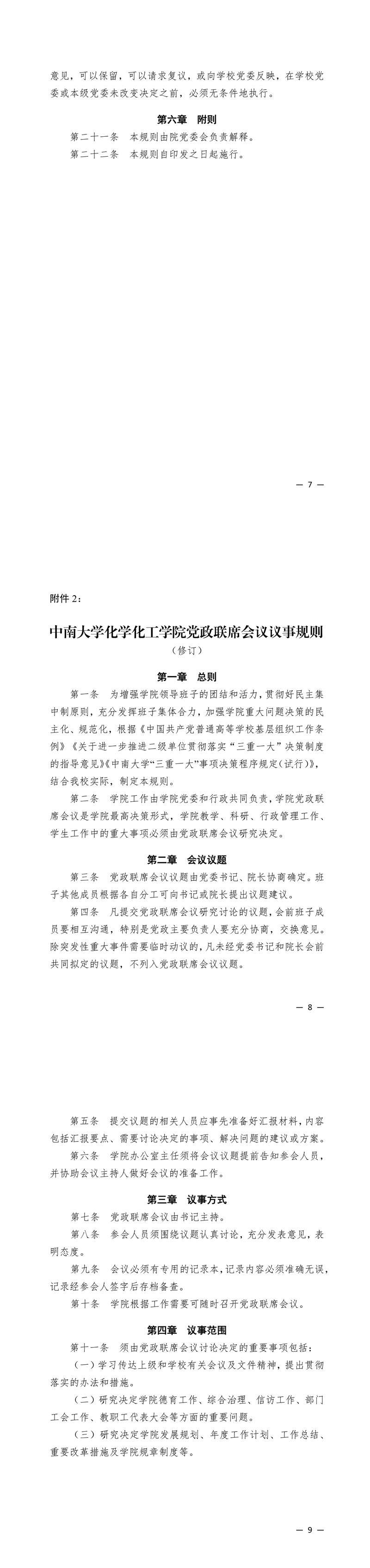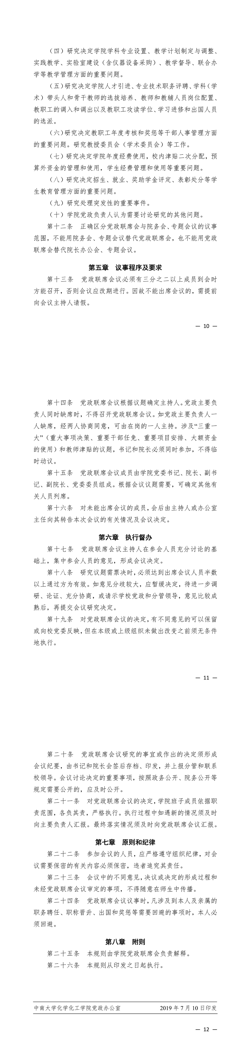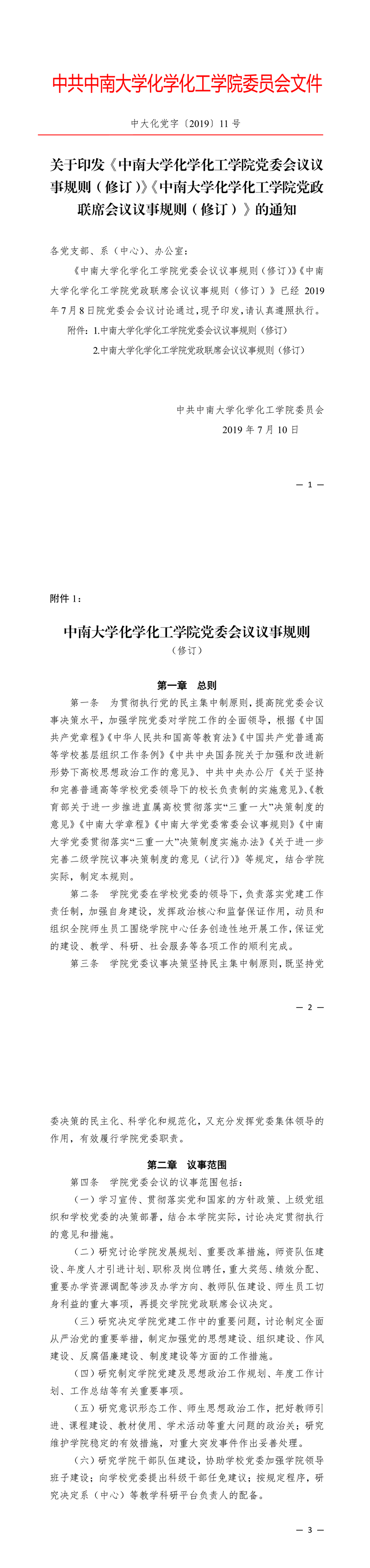 关于印发《中南大学化学化工学院党委会议议事规则(修订)》《中南大学化学化工学院党政联席会议议事规则(修订)》的通知