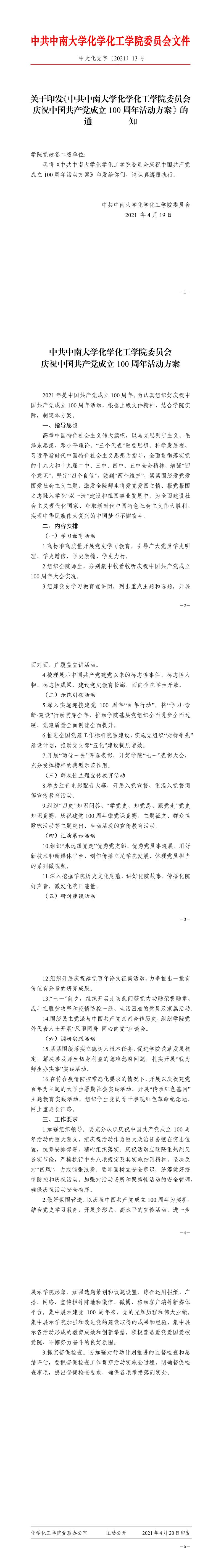 关于印发《中共中南大学化学化工学院委员会庆祝中国共产党成立100周年活动方案》的通知