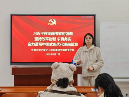 紧接着,支部书记谭澳利同志领学学习“习近平在湖南考察时强调坚持改革创新 求真务实 奋力谱写中国式现代化湖南篇章”相关讲话精神。随后,支部书记作年度述职报告,向党员大会述职。她指出,在2024年度,本支部在加强政治建设、发挥战斗堡垒作用和落实上级决策部署等方面取得了一定成效,但也存在一定问题和不足,并提出了具体的整改措施。