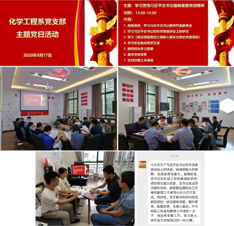 全体党员集中学习了习近平总书记在教师节寄语、关于思政课的论述,观看了《人民教育家》等视频。重点学习了习近平总书记在科学家座谈会上的讲话。支委班子为支部每一名教师购买了《科技创新热点辨析》并结合学科发展和教学科研实际,开展了研讨。