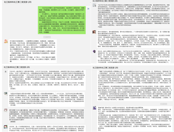 习总书记对青年人寄予肯定和期待,肯定青年人思维活跃、真情奉献、传递能量,尤其是抗击疫情时表现出的担当精神,期待青年人在个人价值、社会服务、国际合作等方面的成就。作为青年人,危难时刻要挑起大梁,如同抗击疫情时在一线救助、在研发岗位坚守、作为志愿者服务的那样。党支部同志均表示,要坚定理想信念,站稳人民立场,练就过硬本领,投身强国伟业,始终保持艰苦奋斗的前进姿态,发扬五四精神,在奋斗中出彩。