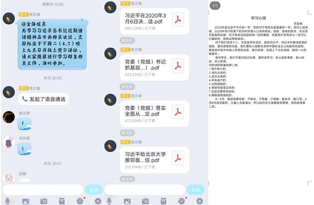 2020年4月7日晚上九点,化学化工学院硕士生分化第一党支部通过QQ语音开展线上主题党日活动,专题学习习近平总书记近期重要讲话精神及相关文件,并讨论了本支部2020年度工作计划。支部书记陈文潮主持会议,全体党员参加。