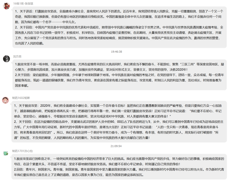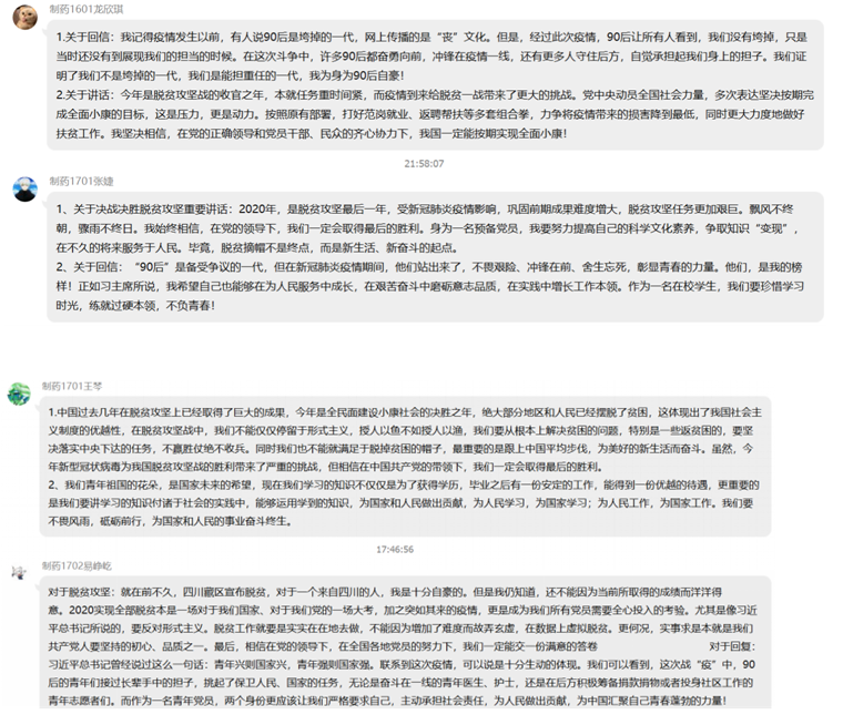 为响应国家号召居家隔离,积极抗疫,本科生制药党支部于3月30日以线上方式进行了一次特别的党日活动。支部成员在QQ群线上学习了《习近平2020年3月6日出席决战决胜脱贫攻坚座谈会并发表重要讲话》以及习近平总书记给青年一代的两封回信等文章,了解了习近平总书记对于决战决胜脱贫攻坚任务的叮嘱以及总书记对青年一代的期望和赞许。学习完成后,支部成员纷纷在线上发表了自己 的学习感想。