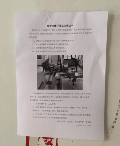 为了强化大家的环保意识,博士化学第二党支部和第一党支部特此在一楼的公告栏出公布了倡议书,并将将院楼出现的问题以实物照片给予公布,以引起大家共鸣及重视。